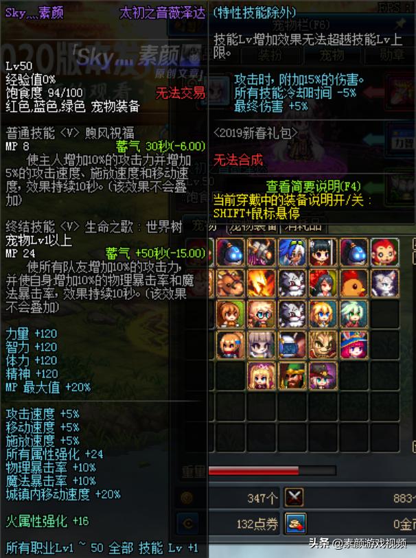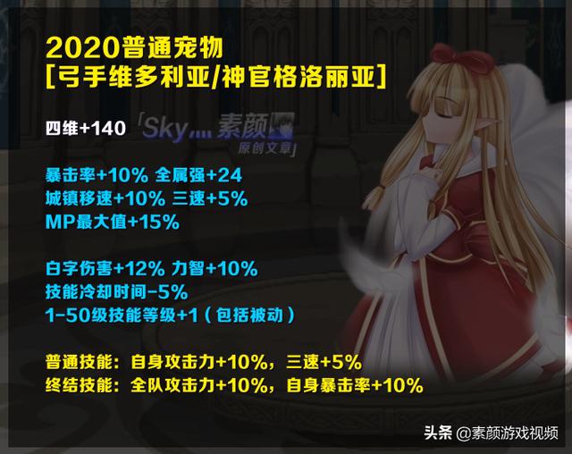 [2020普通宠物]可增加140点四维、10%暴击率、24点全属强、12%白字伤害、10%力智,可使技能冷却时间-5%、1~50级技能等级+1(包括被动); 普通技能可使自身攻击力+10%、三速+5%, 终结技能可使全队攻击力+10%、自身暴击率+10%。