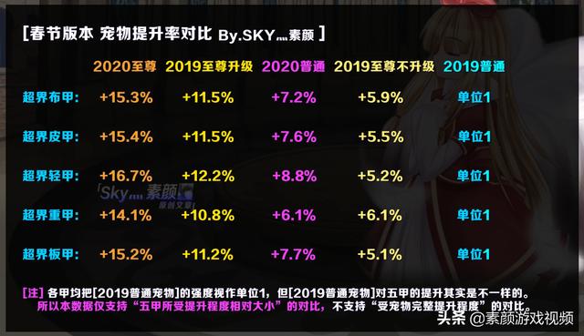 在把[2019普通宠物]换成[2020普通宠物]之后, 超界五甲可获得6.1%~8.8%的提升,这个提升程度主要是由超界五甲各自的百分比力智基数决定的。其中[轻甲]由于百分比力智基数最低,获得的相对提升程度就最大;[重甲]由于百分比力智基数最高,获得的相对提升程度就最小。