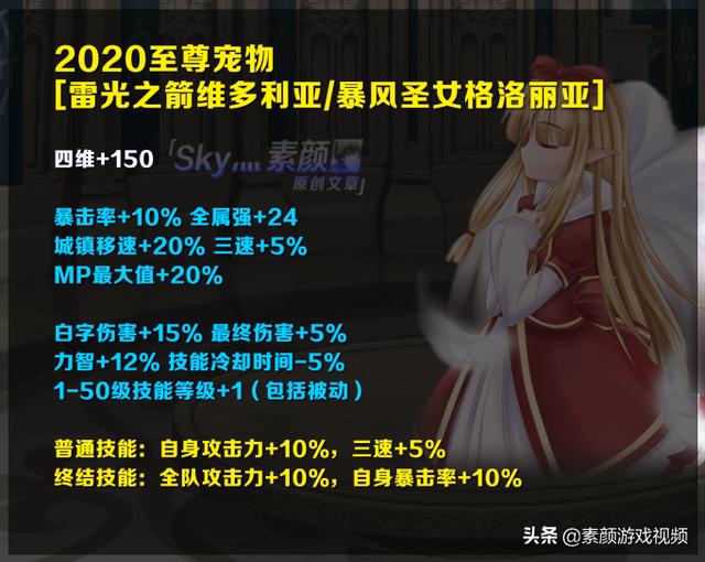 [2020至尊宠物]可增加150点四维、10%暴击率、24点全属强、15%白字伤害、5%最终伤害、12%力智,可使技能冷却时间-5%、1~50级技能等级+1(包括被动); 普通技能可使自身攻击力+10%、三速+5%, 终结技能可使全队攻击力+10%、自身暴击率+10%。