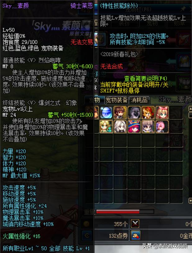 [2019至尊宠物]可增加120点四维、10%暴击率、24点全属强、15%白字伤害、5%最终伤害,可使技能冷却时间-5%、1~50级技能等级+1(包括被动); 普通技能可使自身攻击力+10%、三速+5%, 终结技能可使全队攻击力+10%、自身暴击率+10%。 在使用春节版本积分商城道具对其进行升级后,可再增加8%力智。