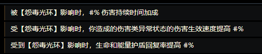 如果有守望之眼的三相暗金珠宝的话,可以考虑以下与怨毒有关的词缀,同时把尊严光环换成怨毒,但是怨毒需求的智力,所以要调整一下装备或者天赋上点取一个+30智力的。