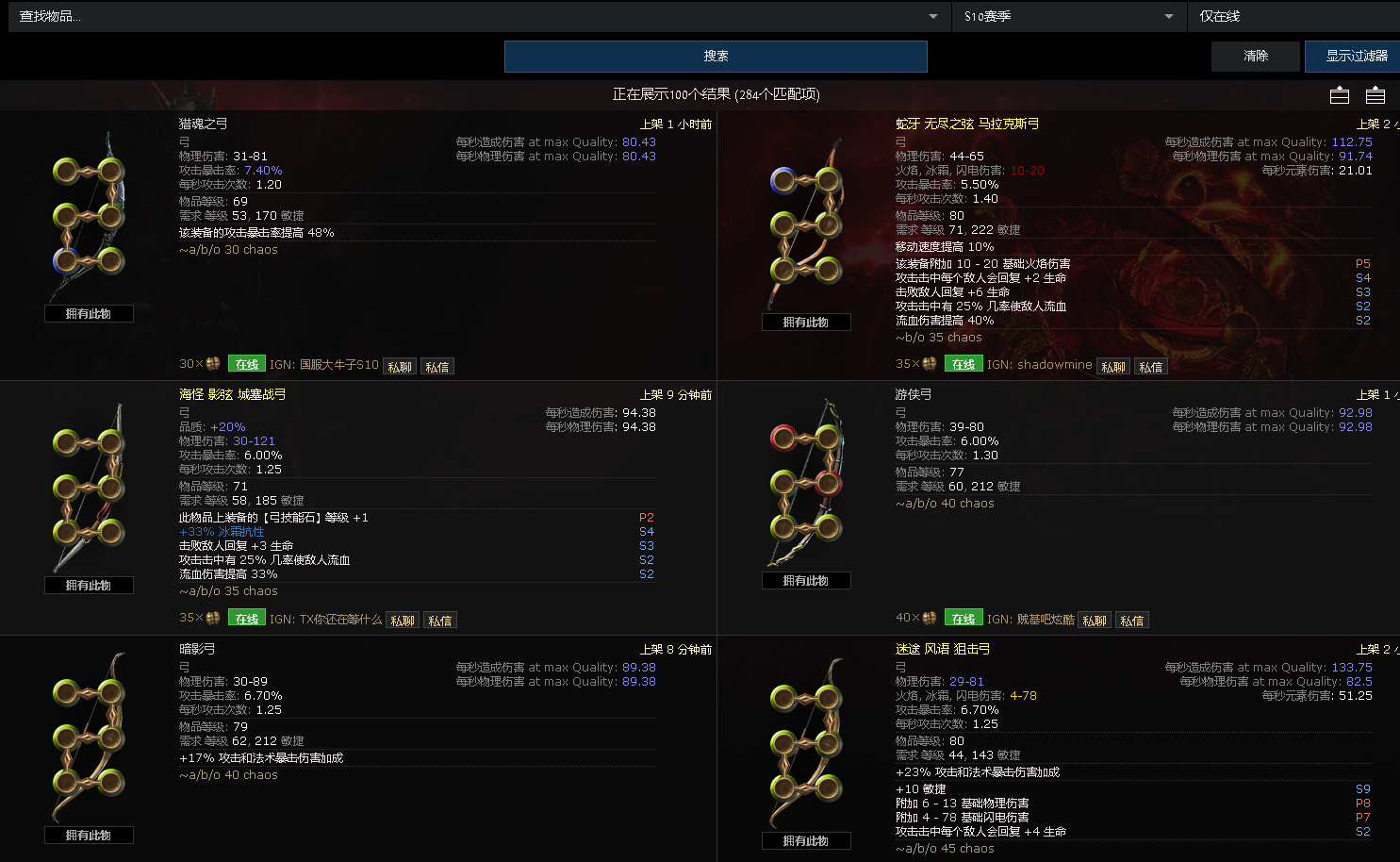 其实武器的选择,有很多种方案。我们需要的是一把高伤害的弓,请注意,这个BD对攻速的要求并不高,攻速并不能提高BD的DPS,但是能提高你刷图的手感。比较廉价实惠的,当然是选择一把刺猬弓(射成筛子命运卡换的6L弓)。更正一下,刺猬弓换的短弓基础伤害实在有点低,这样伤害来源会比较依赖技能石的点伤。所以建议大家还是找一些伤害比较高的弓来做。如果之前有人看了我前面那段用刺猬弓的话,在这里说个抱歉,把刺猬弓转手卖了再买个好一点的底子,6L最好,然后化石洗就行。不过,我不太建议选择1.2攻速的先驱弓,因为真的很慢。