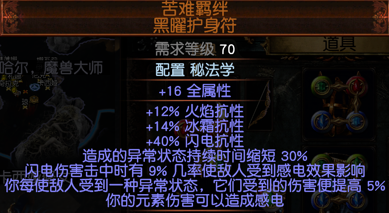 马哥的巧计,装备效果是插槽里的技能能获得独立的元素之相。可以通过往里面插宝宝的技能石,比如纯净之捷,苦痛之捷,或者召唤物来获得元素之相效果,减抗性-50%,很强的增伤组件。本BD推荐使用苦痛之捷,因为这个宝宝本身无敌,远程打击,而且攻速快(旋风斩容易叠毒),触发效果很快。只插入一个加召唤物闪电或者火焰伤害的深渊珠宝即可。绿色石头也能获得大量冰抗。当然缺点就是会有25%的魔力保留。
