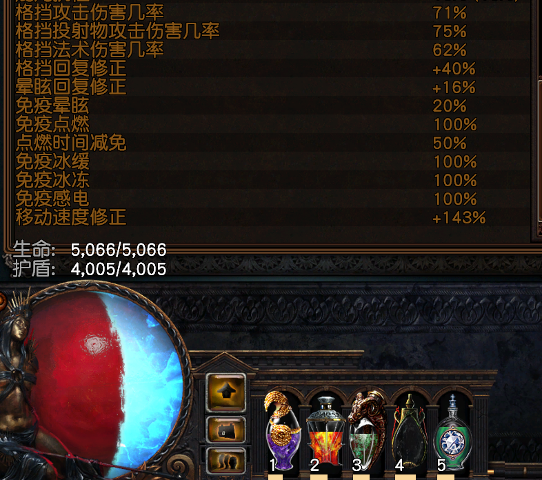 在其他减伤方式上,会采用格挡流,通过装备词缀的合理搭配以及天赋加点,达到了71%的攻击格挡率,75%的投射物格挡率,62%的法术格挡。是完全100%减伤的格挡,不是军团珠宝的翻倍格挡。而因为旋风斩在释放中本身也免晕,所以不需要叠格挡回复的词缀。但也舍弃了双持,选用单持+盾牌的体系。
