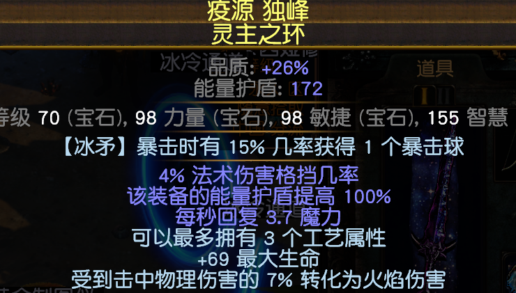 头盔是选择高ES的灵主之环,完美化石点成高品质,然后后致密化石洗出高ES+法术格挡几率。最后多大师两条词缀,可以是生命,护盾,或者物理转伤。魔力恢复这条是费词缀,可忽略。