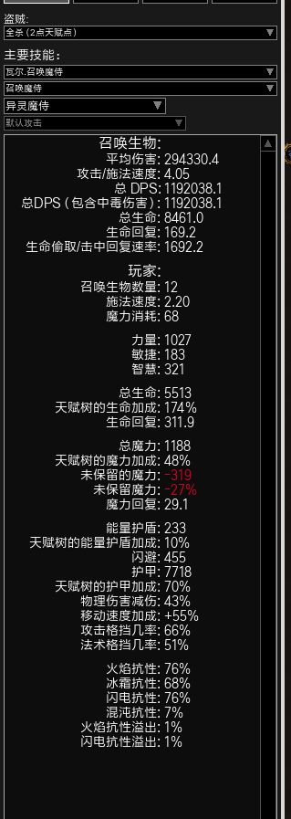 pob不显示圣徒(后面会讲)的附加属性,所以攻击格挡是满的,秒回也在八百左右。另外我的装备很差,相当差,所以血量很不好看。魔力保留也有问题,就先看看吧。