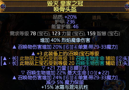 头盔:召唤生物等级+3 召唤生物伤害+3 5L裂界头有条件的当然可以选择+3 召唤生物伤害 生命 6L的唤骨头