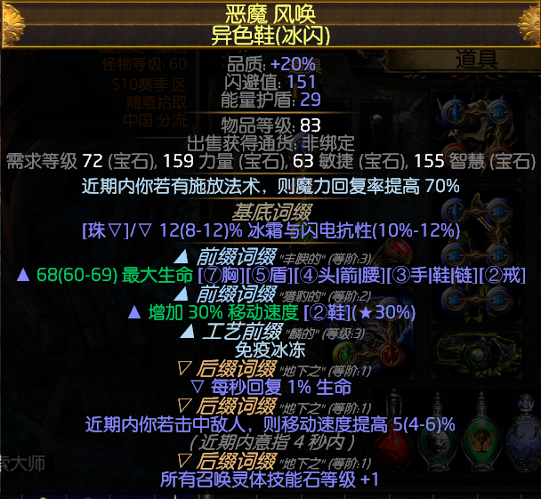 鞋子:移速 生命 秒回带+1灵体自然更美,没有也不追求 一定要有前缀上免冻