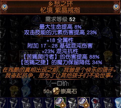 如果要玩低血的话戒指推荐加混沌抗的苦痛之捷戒指,其他还是基本不变,灵体和纯净之捷可以选择一个放弃(孔位不够),用来多开光环,光环建议迅捷,抗性光环等