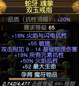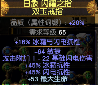 两个黄戒指是你身上抗性的唯一来源,没必要太追求敏捷,先把抗性叠满再说(这两个是我新换的,火炕不够,没办法还在天赋上多点了火炕,但是敏捷上了1800!15个炮台哒哒哒)