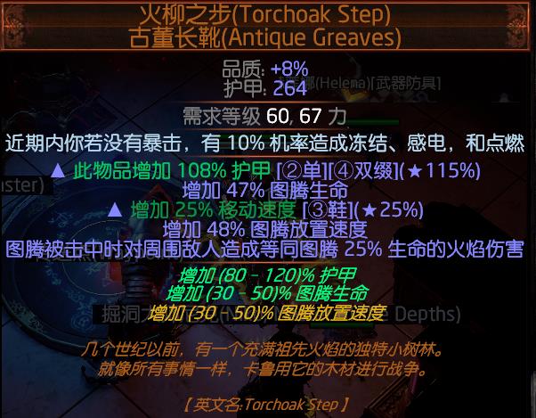 过渡期非常推荐这个暗金图腾鞋子,50%图腾生命和放置速度,可以让我们非常平滑的过度前期,要不是没有血我都不想换下它。
