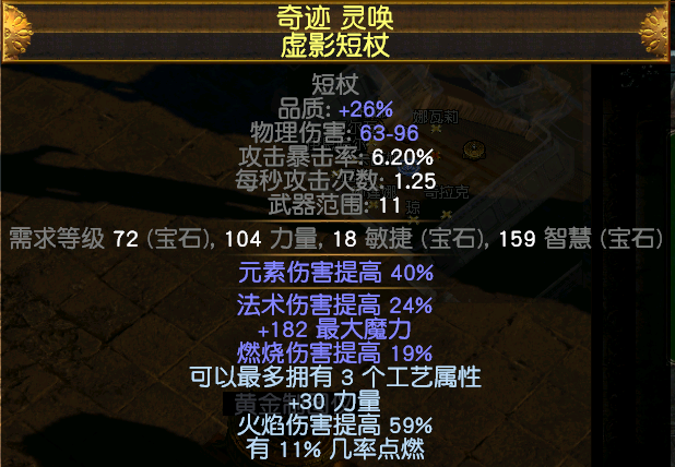 使用:物品等级:84 虚影短杖(约30c),使用改造石(约1E)洗出T1魔力/力量/智慧上富豪石。