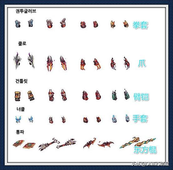 格斗家系列中,武器外观也被曝光,按照拳套、爪、臂铠、手套和东方棍的顺序展示。有眼尖的玩家发现,手套第一个外观,还是颇为好看的。但拳套在设计方面,就没有那么帅气,很稀疏平常。