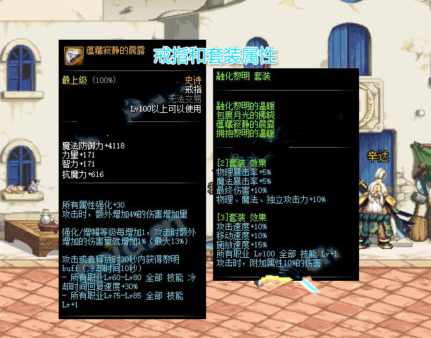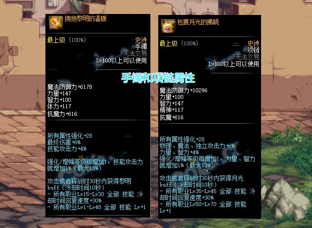 项链部位全属强+28,三攻+6%,力智+4%,强化或增幅每增加1级,力智加成1%,最大能加13%,同样有技能buff加成。戒指全属强+30,攻击时额外增加4%的伤害,强化或增幅每增加1级,额外增加1%伤害,最大13%。