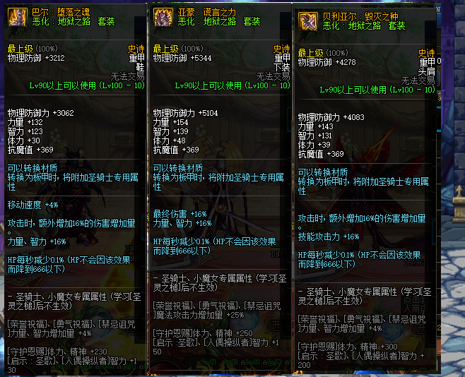 一阵雨的剑影,也通过“肝”深渊的方式,凑齐了“地狱之路”重甲防具,实现了装备毕业。但对一阵雨来说,希洛克团本未出现前,还没有“究极体”达成,毕竟神话装备没爆出来。100级装备快速毕业,“肝”深渊跨界,这是最佳的方式。“地狱之路”这套史诗防具,在属性方面上,则显得非常强悍。