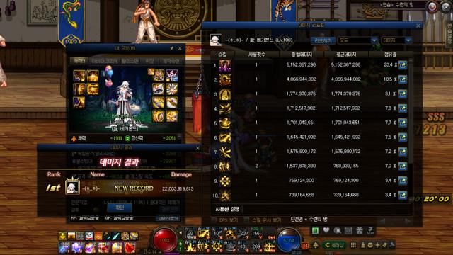修练场测试未升级装备是超界重甲搭配泰波尔斯,20秒打桩的伤害是220亿,除了游龙掌施放2次,其他均为一次施放,这里樱花劫的伤害莫名其妙的低,这会导致后续我们的计算提升率会偏高。