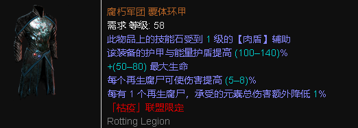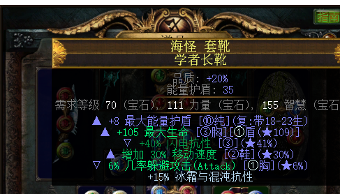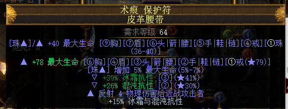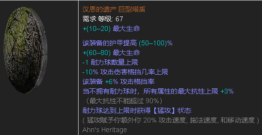 盾牌:廉价盾牌,高格挡、血量、+3%最大抗(如果你在天赋里面放入2个-1耐力球的脆弱珠宝,你自己还能获得猛攻效果),其他的可以选择高血高抗,一定要有混沌抗性的盾牌,或者坚毅塔盾传奇的狮眼盾牌。