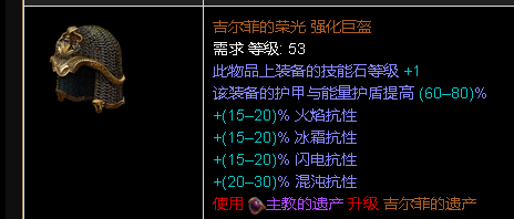 头盔:绑定头盔,这个是没有升级版的,预言“主教的遗产”升级成为我们需要的+1圣物的(预言完成在T2地图“咒怨陵墓”。尽量选择高抗高血,前期没有的话1个圣物也能起飞(参考双人舞思路)。