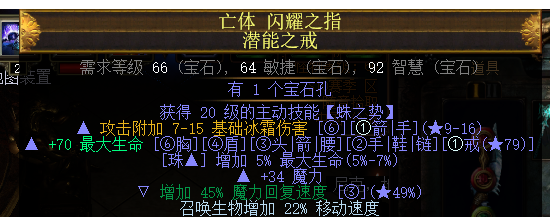 珠宝:血量+召唤生物伤害,蜘蛛可以致盲,可以在珠宝当中找1颗带3-6%致盲效果的珠宝,因为20只蜘蛛攻击触发频率足够了,所以1个就行了。