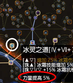 白圈是带有力量百分比词缀的天赋点。只有把该天赋点点亮才能获得下面额外的力量百分之5的属性。
