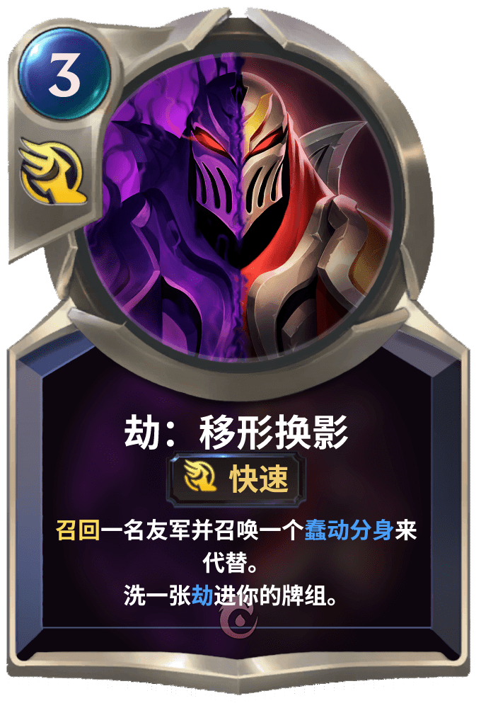 效果:快速 召回一名友军并召唤一个蠢动分身来代替。 洗一张劫进你的牌组。
