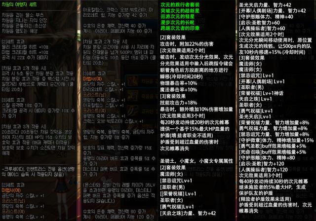 三件套增加18%的技能攻击力,10%的暴击伤害,并且3件套触发次元效果是获得20秒的次元帷幕,相当于15%的HP罩子,在持续期间罩子血量没有消耗完毕时和花花的罩子差不多,但是机动性更强因为可以放技能,相当于一个无敌的霸体效果,但是CD有20秒,对于大部分职业来说非常不错,可以避免使用技能时被怪物中断。不过这一个效果对于奶系职业本身无效,也就是奶爸奶妈这些职业穿戴时不会获得护盾效果。