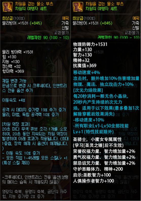 皮甲鞋子增加130的力智是不是很强,不过很正常,一百级的史诗装备四维都超过一百,增幅提升率越来越小了。鞋子是增加10%的追加黄字,并且20秒可以触发一个次元力场效果,消耗1颗无色获得10%的移动速度加成和1-50级的技能等级增加1级,对于奶系职业,特别是奶妈来说非常的合适,增加勇气祝福和一觉,还有130的智力加成。