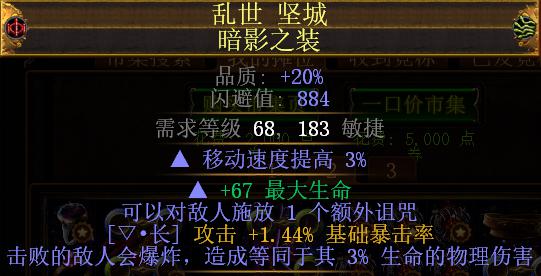 诅咒基础暴击版:由于额外诅咒+1从工艺台移除,搬到了猎人词缀的衣服上,获取难度提升。这个版的衣服意义在于提升单体输出,配合戒指的击中附带诅咒可达到双诅咒并存,搭配技能的大范围,也能做到相对来说高效率的清图,较大的提升对BOSS还有组合怪的输出。获取方法可由猎人衣服单出前缀额外诅咒+1,外加猎人衣服可拥有双基础暴击后缀,但是双暴后缀获取太难,本BD主要还是以基础攻击暴击为主。还有就是通过裂界基础暴击后缀合成而得。造价大概6-8E