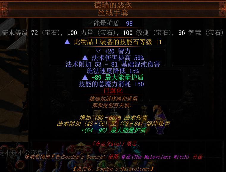 手套:德瑞的恶念,绑定暗金。通过德瑞的精神手套升级,获得魔力消耗+50搭配尿布头完美契合尿布头的回复效果。比较完美的就瓦出+1技能等级,通过+1等级提升沙形态,达到高冷却,高技能范围效果。(普通升级的手套大家买个预言30C左右,追求完美就+1吧)