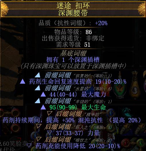 腰带:选择使用深渊腰带,通过谵妄的精华点出药剂持续期间+50%混沌抗性(使用催化剂最高可达到60%),配合女王水,可达到75%的混抗。其次还需要有一条的属性就是药剂充能使用降低,进一步提升药剂的使用次数。其余血量蓝量都可,视情况补充基础属性.造价C价。