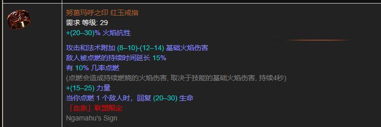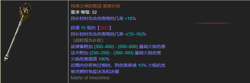 核心机制:martyr长杖(纯净之神)+sunspite鞋子(日怨)+gamahu’s戒指(点燃回血戒指)+凤凰项链(自点燃项链),保持自点燃并大量增伤。并且免疫点燃冰缓冰冻。