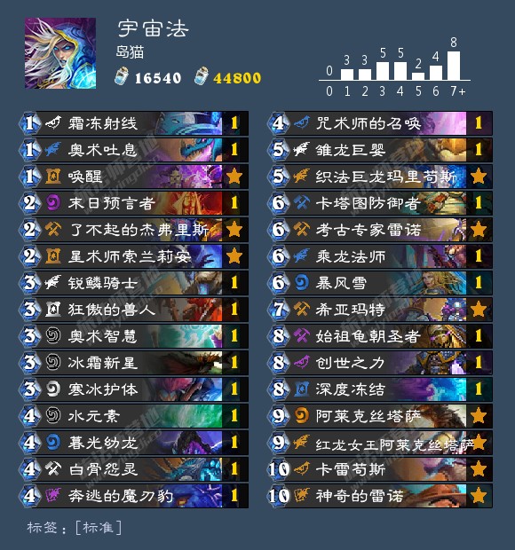 炉石新年以后,宇宙法失去了露娜的口袋银河这一最大超展开手段,强度有所下降,但星术师索兰莉安使得卡组强度得到了不小弥补。笔者在天梯遇到岛猫时两度优势场面被终极随从一张翻盘。卡组主体仍为上版本宇宙法构筑,dh削弱后岛猫舍弃了小软,加入了法师新橙唤醒。其余亮点单卡方面,狂傲的兽人是一张较好处理频率的优质随从,水元素与深度冻结则在对阵各类带刀及jk卡组时效果显著(尤其是对阵dh,水元素冻脸+冰环等操作会让对面难以操作,十分难受)。新卡唤醒是一张讲故事的好卡,只要能剩余六七费时开出至少5张就能保证有不少操作空间。当前天梯环境下还充斥着不少各类瞎以及抓瞎卡组,宇宙法在对阵这些卡组时均有很大的操作空间。同时需要注意的是最近极限快攻猎又有抬头之势,若环境里猎人较多建议谨慎使用宇宙法。卡组耗尘较多,但多数均为之前版本法师橙,推荐给大家上分使用。
