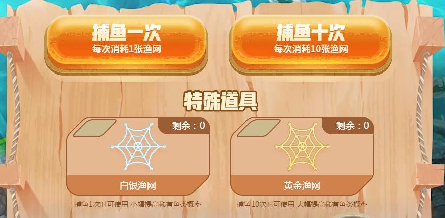 捕鱼:可消耗渔网进行捕鱼,每次捕鱼消耗一个渔网,捕到不同种类的鱼可以获得该种类鱼所对应的随机道具奖励。每次捕鱼有概率额外获得特殊捕鱼道具:白银渔网和黄金渔网;捕鱼1次时,可以额外使用1张白银渔网,能小幅度提高捕到稀有鱼类的概率;捕鱼10次时,可以额外使用10张黄金渔网,能大幅度提高捕到稀有鱼类的概率;