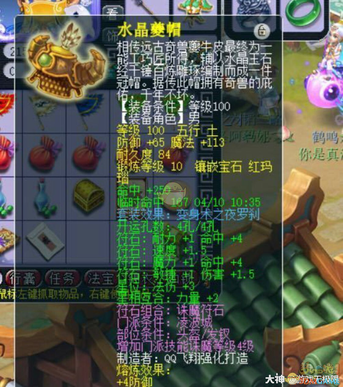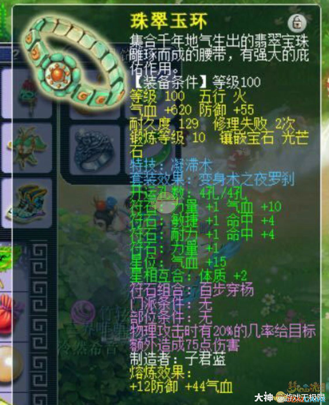100级的腰带,10锻光芒石,熔炼后67的防御和664的气血,属性还可以,凝滞术的特技加上夜罗刹的套装,凝滞术的特技偏向辅助门派,点化物理套装,两者没什么关联,价格同样不会贵,而且还失败了两次。