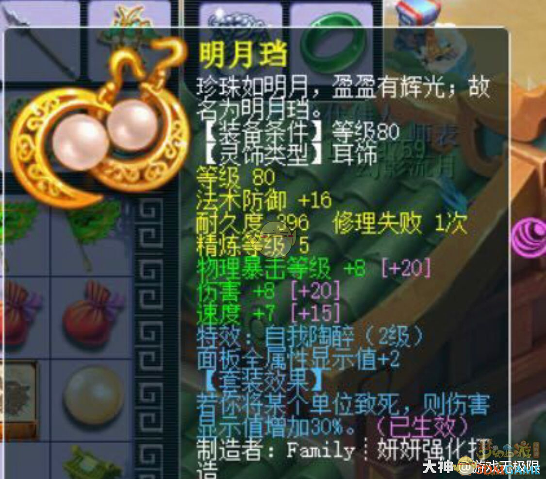 80级的佩饰,主属性速度加了16点,下排是双防御加上一条格挡值。