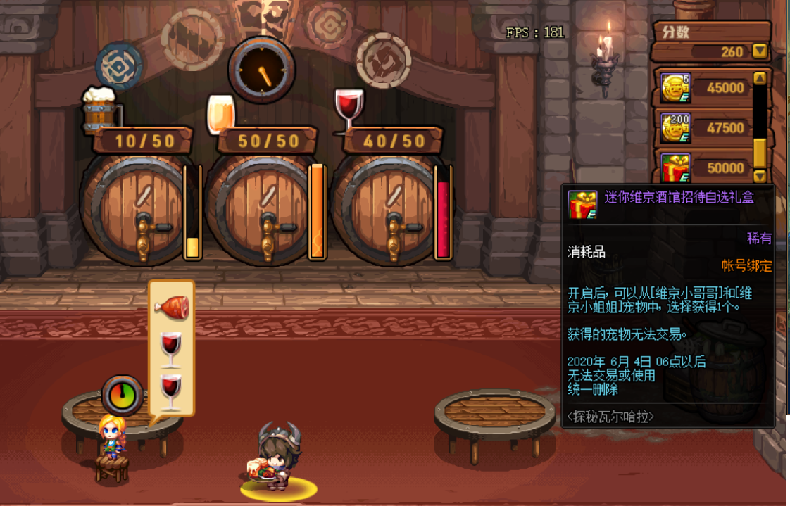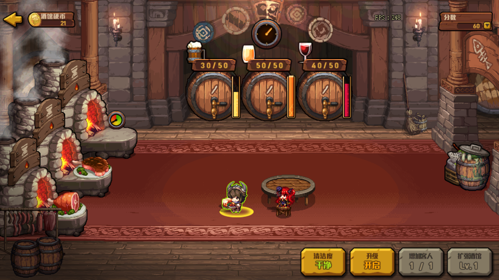 游戏玩法是根据顾客的需要去取对应的饮料或者食物去给顾客,给对了就会给酒馆硬币用于升级酒馆,扩充客人从而更快的拿到分数,不同的分数可以获得不同的维京硬币。