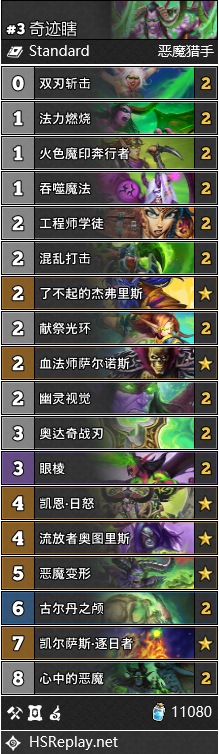 奇迹瞎的两张核心卡牌在削弱之后,无法一回合内同时打出,让原本就容易卡流放的这个套牌更加僵硬,完成OTK的难度也大大提高。环境对恶魔猎手的恶意也越发明显,冰霜织影者和武器针对越发频繁,激怒战对这个卡组而言更是绝望的对局。这个卡组除了面对术士以外没有显著优势的对局,而祈求术本身就是日薄西山。