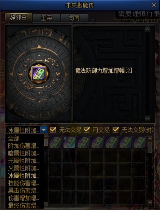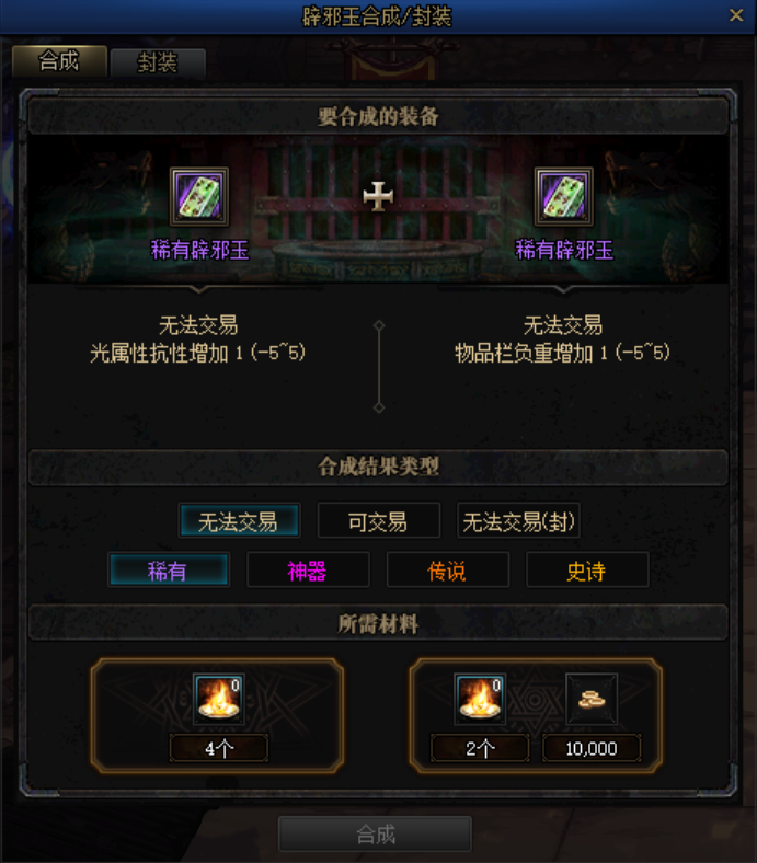 获得的避邪玉可以通关怀隐的避邪玉系统进行合成和封装,需要注意的是相同品级的合成出的是相同品级的。如果选择的是无法交易的和可交易的封装合成,那出的结果可能是随机一种。