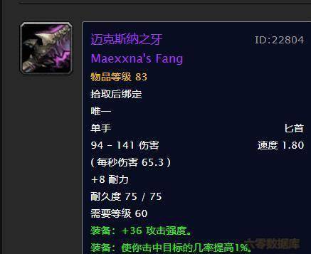 很多人看来,迈克斯纳之牙是可以在盗贼匕首中排到第三位的,有着1.8的攻速,非常适合主手;秒伤高达65.3,比末日先驱略低一些,外加8点耐力、36攻强以及1%暴击。