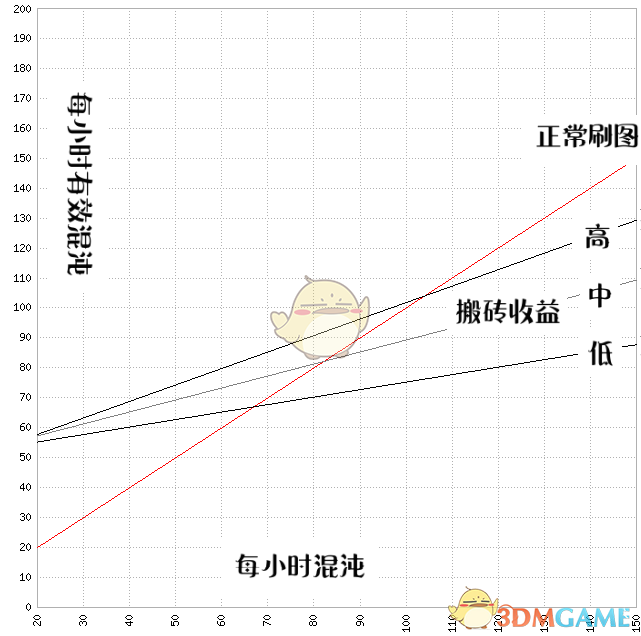 现在你应该能对这个图有更好的理解了,从下面的低收益到高收益和正常刷图的对比。换句话说,如果我正常刷图收益是XXX的话如何判断我应该搬砖与否呢。现在再次看这张图。