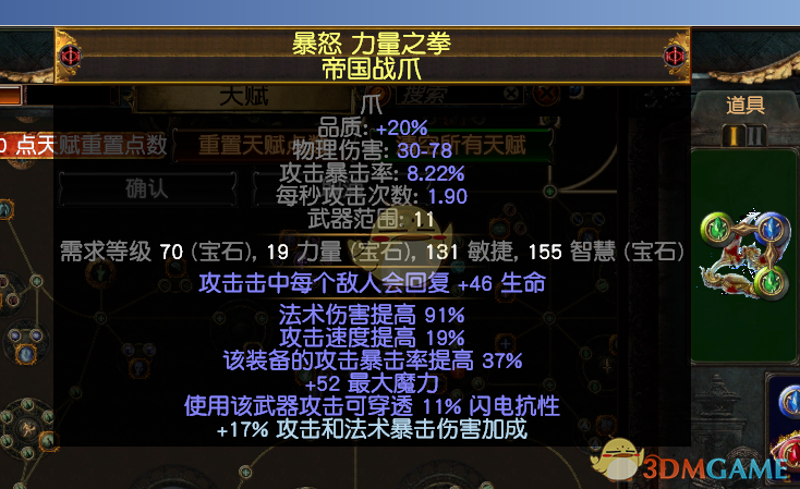 武器选择:这个武器开荒可以用蜂巢涌动代替,后期可以找有攻速跟暴击后缀的帝国爪附魔法术伤害或者用精华点出攻速跟武器暴击后缀。选择爪子主要是考虑爪子提供一定的击回大约能提供4,500的秒回。加上酋长升华有1%的火焰吸血,跟大量的恢复,联合奉献地面结合起来恢复量也很可观了,不需要额外投入资源到恢复上。