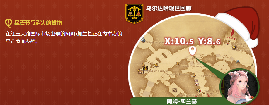 又到一年一度季节活动开启的时候了!今年的季节活动星芒节,玩家们将扮成传说中为孩子们赠送礼物的圣人的追随者,在福隆戴尔药学院儿科病房举行特别活动!而本次星芒节在红玉大路国际市场出现的阿姆·加兰基似乎为之有什么苦恼,到底是怎么一回事呢?接下来便随小编一起来看一看!