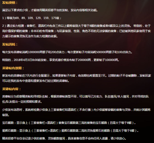 为了鼓励玩家多多体验精英招募平台,并在其中找到适合自己的队友,从即日起到4月3日,玩家可以以20万两银子的优惠价格发布招募信息,更新信息价格更低至10万两!想要找到队友的玩家千万不要错过这一最好时机!