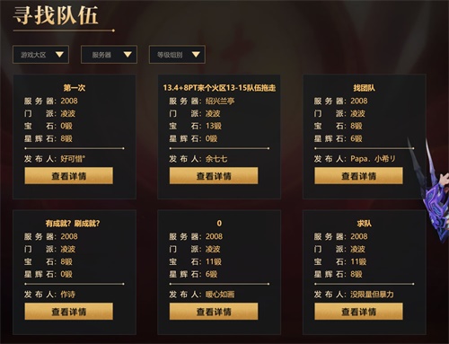 等级为69、89、109、129、159和175的玩家,只要前往长安城(150,96)的精英招募使者处发布英雄帖,或在其中浏览其他玩家留下的英雄帖,就有机会寻找到属于自己的天命队友!