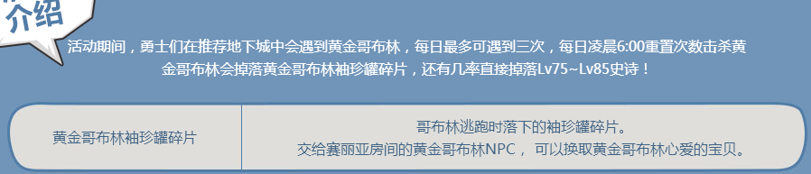 活动期间,勇士们在推荐地下城中会遇到黄金哥布林,每日最多可遇到三次,每日凌晨6:00重置次数击杀黄金哥布林会掉落黄金哥布林袖珍罐碎片,还有几率直接掉落Lv75~Lv85史诗!