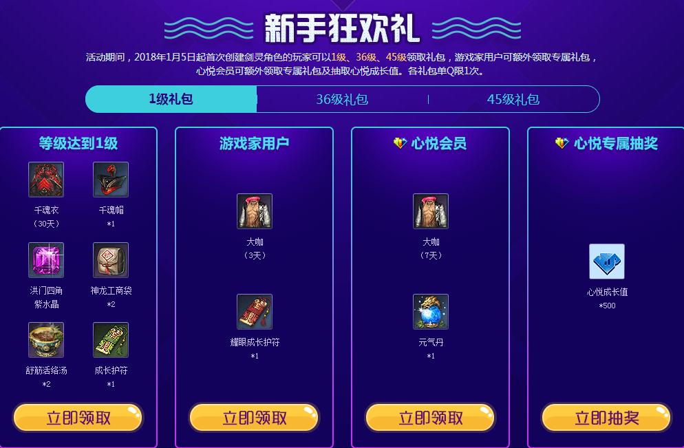 活动期间,2018年1月5日起首次创建剑灵角色的玩家可以1级、36级、45级领取礼包,游戏家用户可额外领取专属礼包,