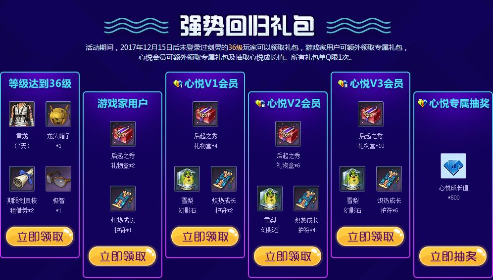 活动期间,2017年12月15日后未登录过剑灵的36级玩家可以领取礼包,游戏家用户可额外领取专属礼包,