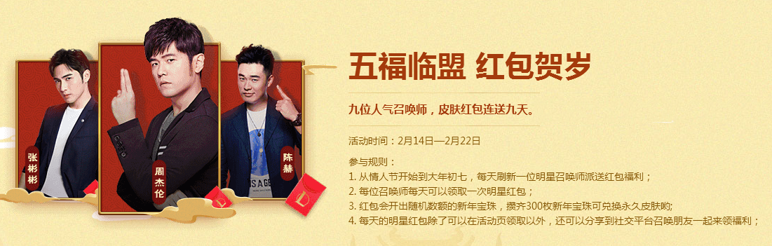 1、从情人节开始到大年初七,每天刷新一位明星召唤师派送红包福利;