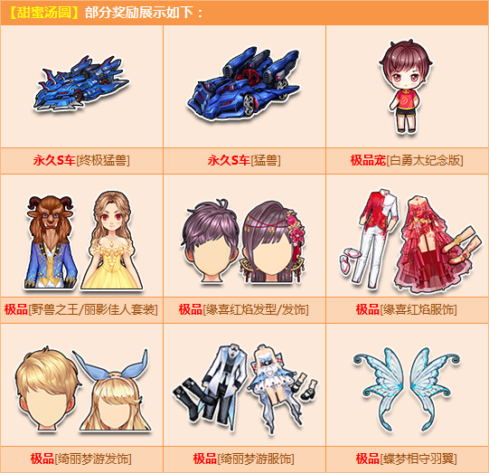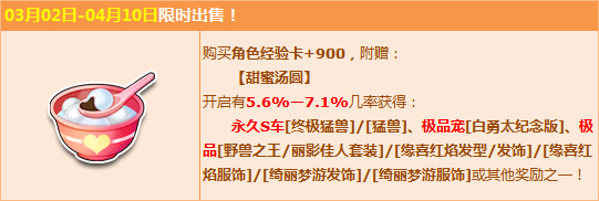 活动期间,购【角色经验卡+900】,附赠甜蜜汤圆,有机会得永久S车【终极猛兽】/【猛兽】、极品宠【白勇太纪念版】、极品【野兽之王/丽影佳人套装】/【缘喜红焰发型/发饰】/【缘喜红焰服饰】/【绮丽梦游发饰】/【绮丽梦游服饰】或其他奖励之一!