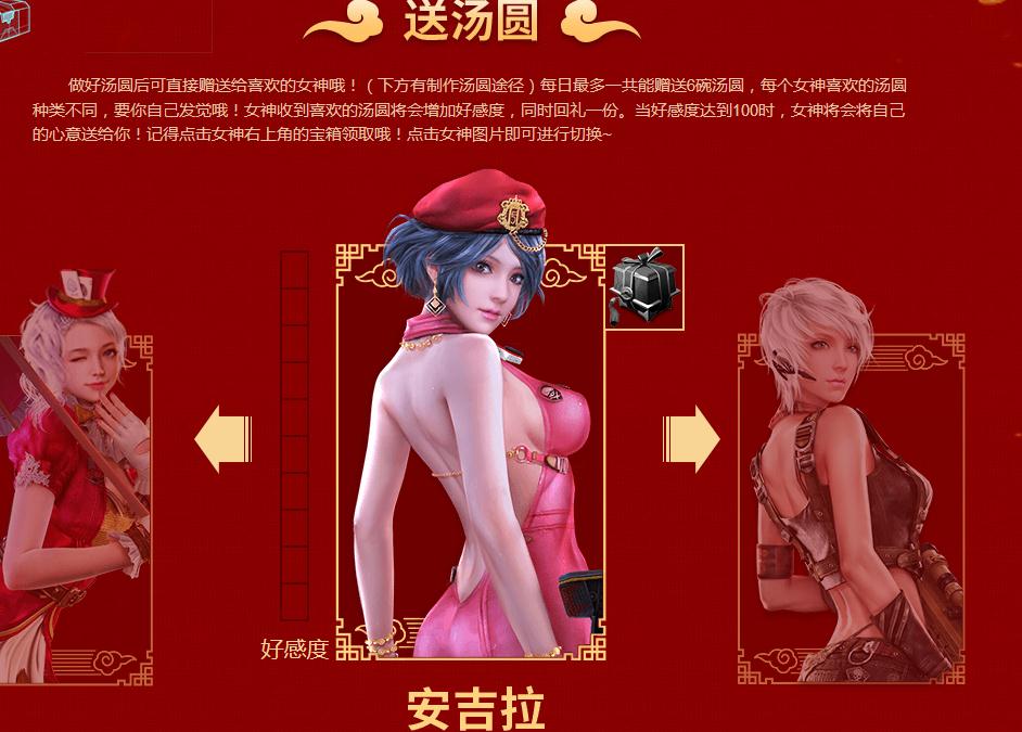 做好汤圆后可直接赠送给喜欢的女神哦!(下方有制作汤圆途径)每日最多一共能赠送6碗汤圆,每个女神喜欢的汤圆种类不同,要你自己发觉哦!女神收到喜欢的汤圆将会增加好感度,同时回礼一份。当好感度达到100时,女神将会将自己的心意送给你!记得点击女神右上角的宝箱领取哦!点击女神图片即可进行切换~